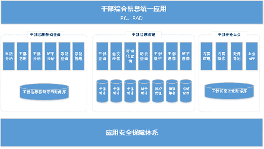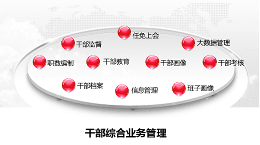 干部综合信息管理平台是依据《中共中央组织部全国组织人事管理信息系统信息结构体系标准》进行数据库设计,符合干部管理政策、满足干部管理需求、用户易学易用的软件产品。该平台具备干部信息管理、信息移动查询、干部任免上会三大功能,包括组织机构、编制职数、干部名册、干部任免审批表、干部培训、干部考核、干部监督、向组织说说心里话、干部画像、班子画像、任免上会等工作业务应用,以及全文检索、可视化查询、智能词组、分析研判、辅助决策等数据挖掘分析。