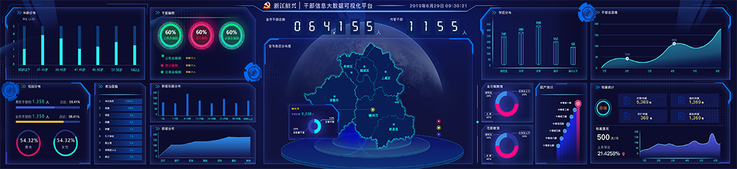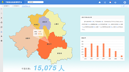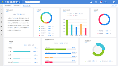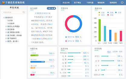 1、 智能分析:全局统计全市干部信息,按照数量、性别、年龄、党派、职级、学历等信息进行图形化的展示,对统计数据进行反查便于实时掌握全市干部动态。