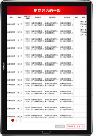 4、干部上会APP:干部上会APP具备安全保密检查机制,设备在打开WIFI、蓝牙等无线功能情况下,系统无法启动。同时,还具备上会方案查看、干部任免审批表、干部考察材料、干部搜索等功能。